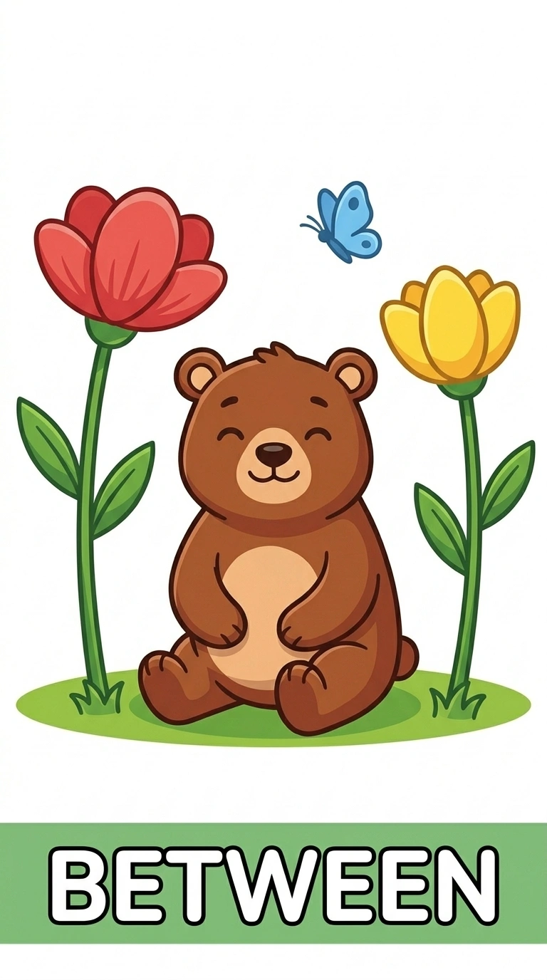 Benny the Bear has found a very beautiful spot in the meadow to rest. He is sitting on the green grass and he looks very peaceful with his eyes closed. If you look at his sides, you will see a tall red flower on one side and a tall yellow flower on the other side. Because there is a flower on both sides of him, we say Benny is sitting between them. A little blue butterfly is even flying above him to say hello. This card helps you learn how to use the word between to describe when something is in the middle of two other things while you explore the forest with Benny.