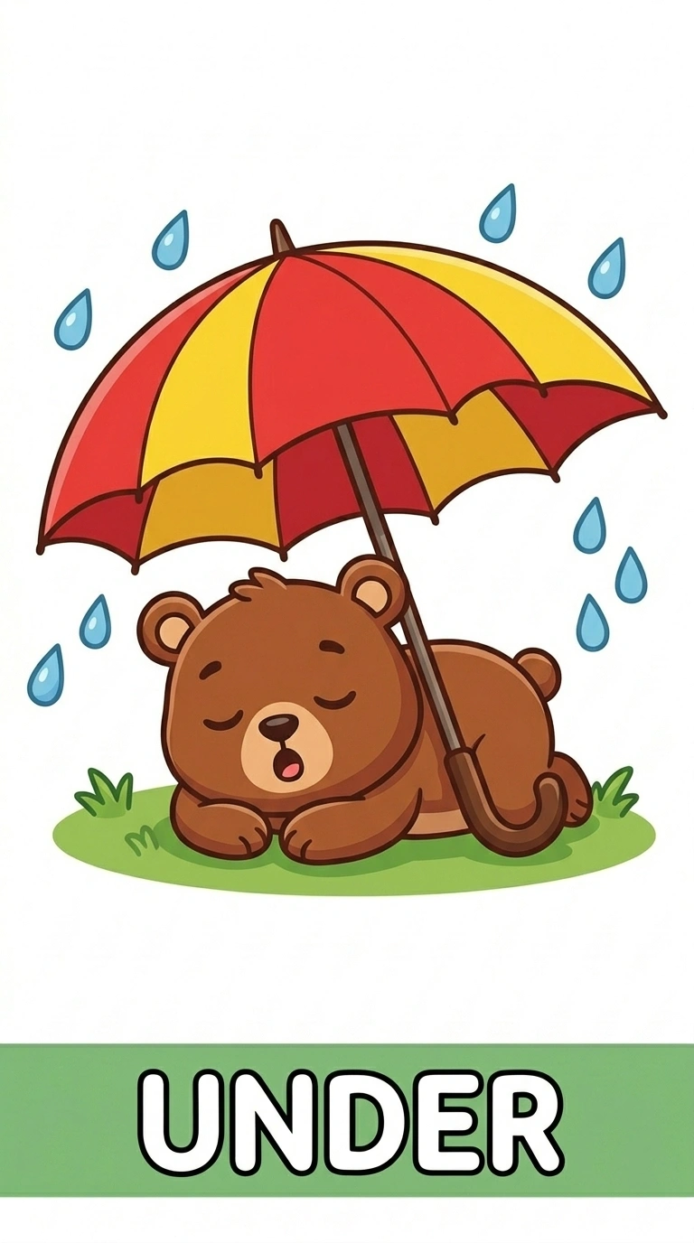 Oh look, it is raining in the forest! Benny the Bear is a very smart bear because he found a bright red and yellow umbrella to keep him dry. He is lying down on the soft green grass and having a peaceful nap while the rain falls all around him. He is tucked away safely because he is underneath the umbrella. When something is below something else like this, we say it is "under." Can you hear the pitter-patter of the raindrops hitting the top of the umbrella? Benny looks so cozy and warm. This card is a wonderful way to learn how to use the word under while we explore Benny's rainy day adventure.