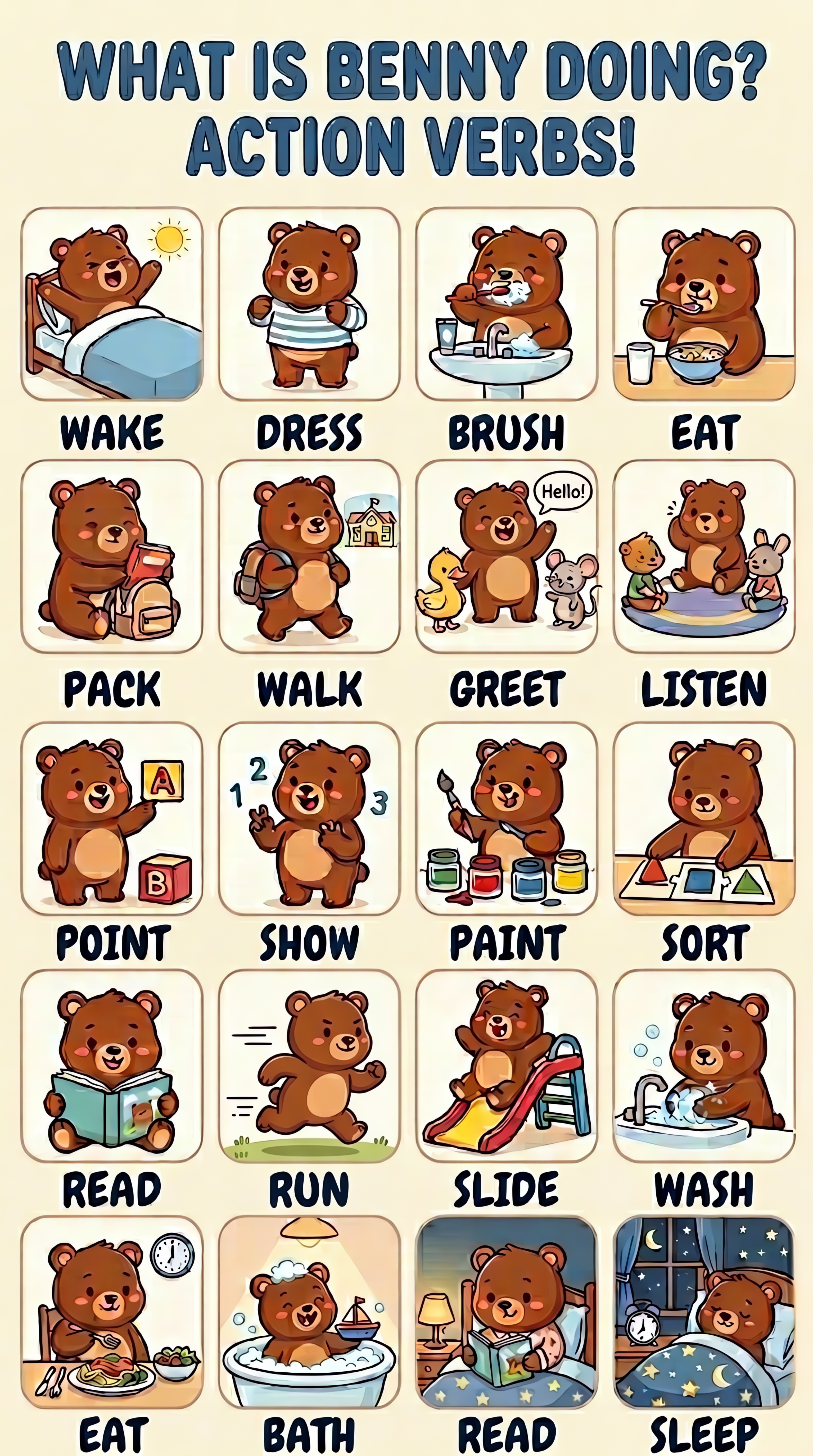 Can you do what Benny does? Benny is a very busy little bear and he loves to stay active all day long! This magical chart shows you all the secret actions Benny takes from morning to night. Look at him "Slide" down the big yellow slide or "Paint" with bright colors. Benny knows how to "Listen" to his friends and "Sort" his shapes in the right boxes. Have you ever wondered how many things your body can do in just one day? Every little square shows a new action verb, which is a special word for "doing." Whether Benny is "Running" fast through the grass or "Washing" his paws before dinner, he is always learning something new. Follow Benny's adventure and see which action is your favorite to try today!