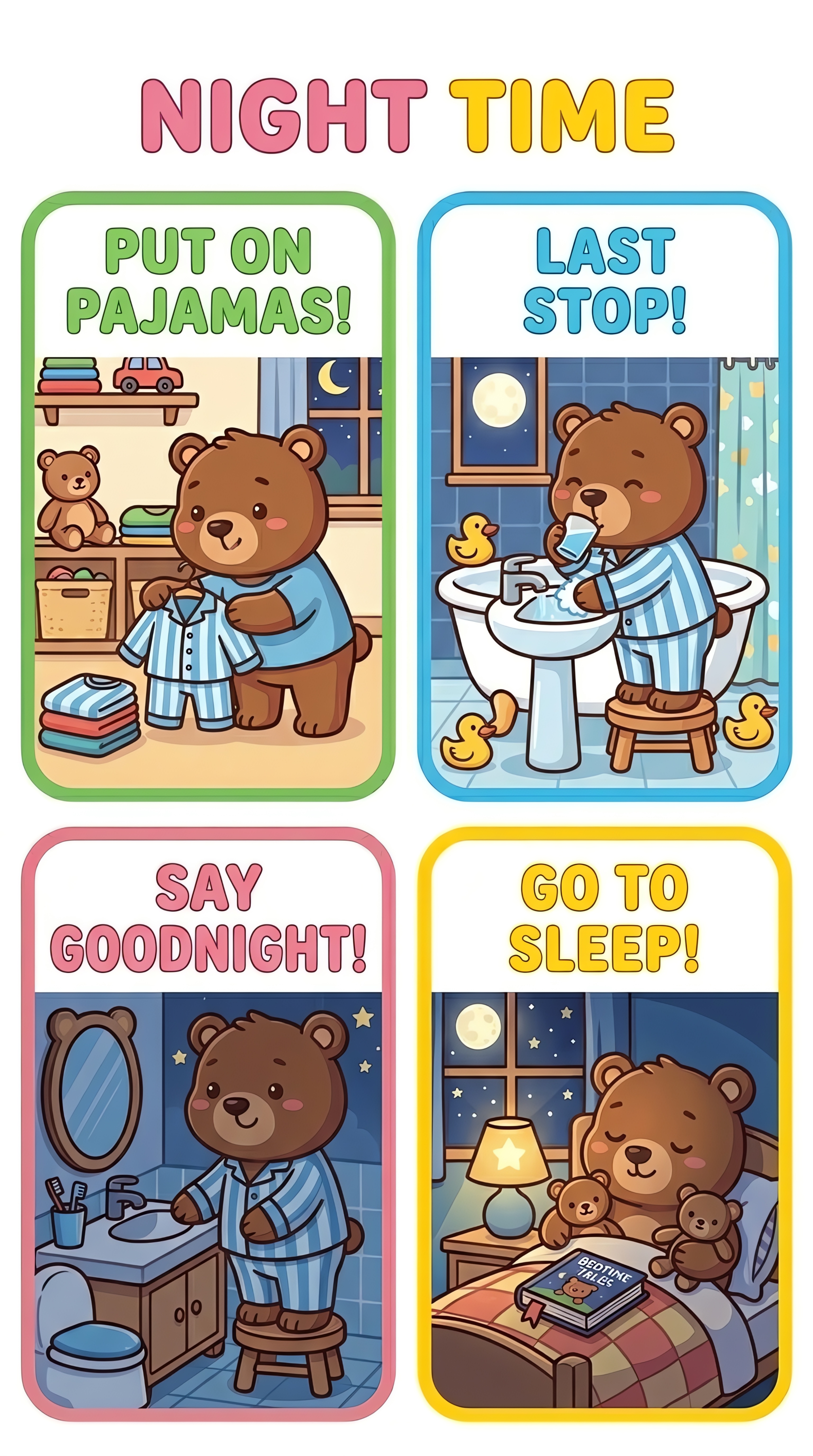 The stars are out and it is time for sleepy-head adventures! In the quiet forest, the moon is shining bright and it is time for Benny the Bear to get ready for dreamland. First, he picks out his softest striped pajamas to stay cozy all night. Then comes the last stop at the sink for a quick wash and a drink of water. Look at Benny saying goodnight to himself in the mirror—he is ready for rest! Finally, he snuggles into bed with his favorite teddy bear friends and a bedtime book. Have you ever wondered if the stars whisper secret stories while we sleep? Benny thinks they tell the best tales of magic and fun. Following these steps helps Benny feel safe and warm until the morning sun comes back. Which teddy bear would you snuggle with tonight?
