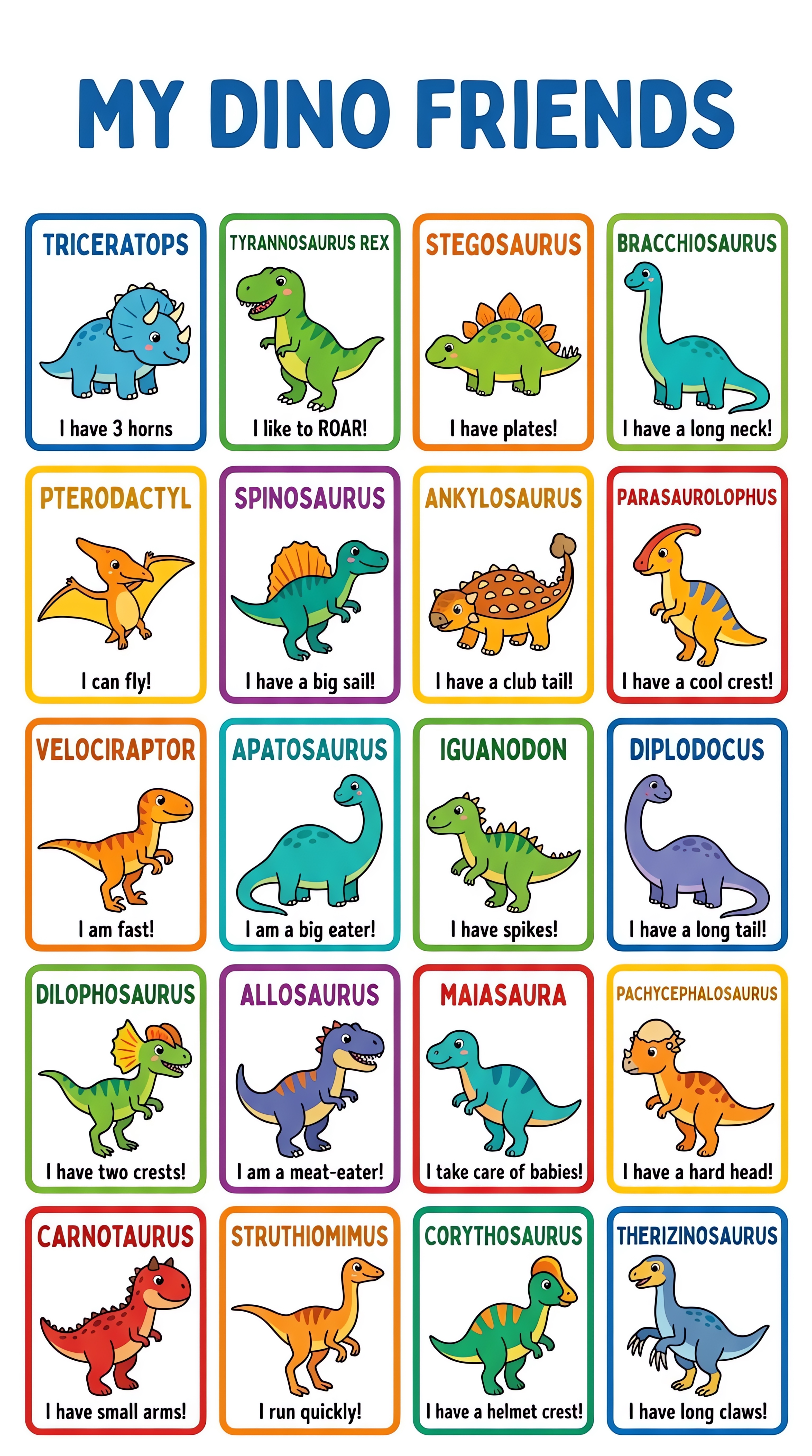 Hello little explorer! Are you ready to meet twenty amazing dino friends? You can practice your reading by looking at each dinosaur and learning what makes them special. Whether you like the spikey ones or the ones that fly, these dinosaurs are so happy to be your best friends!