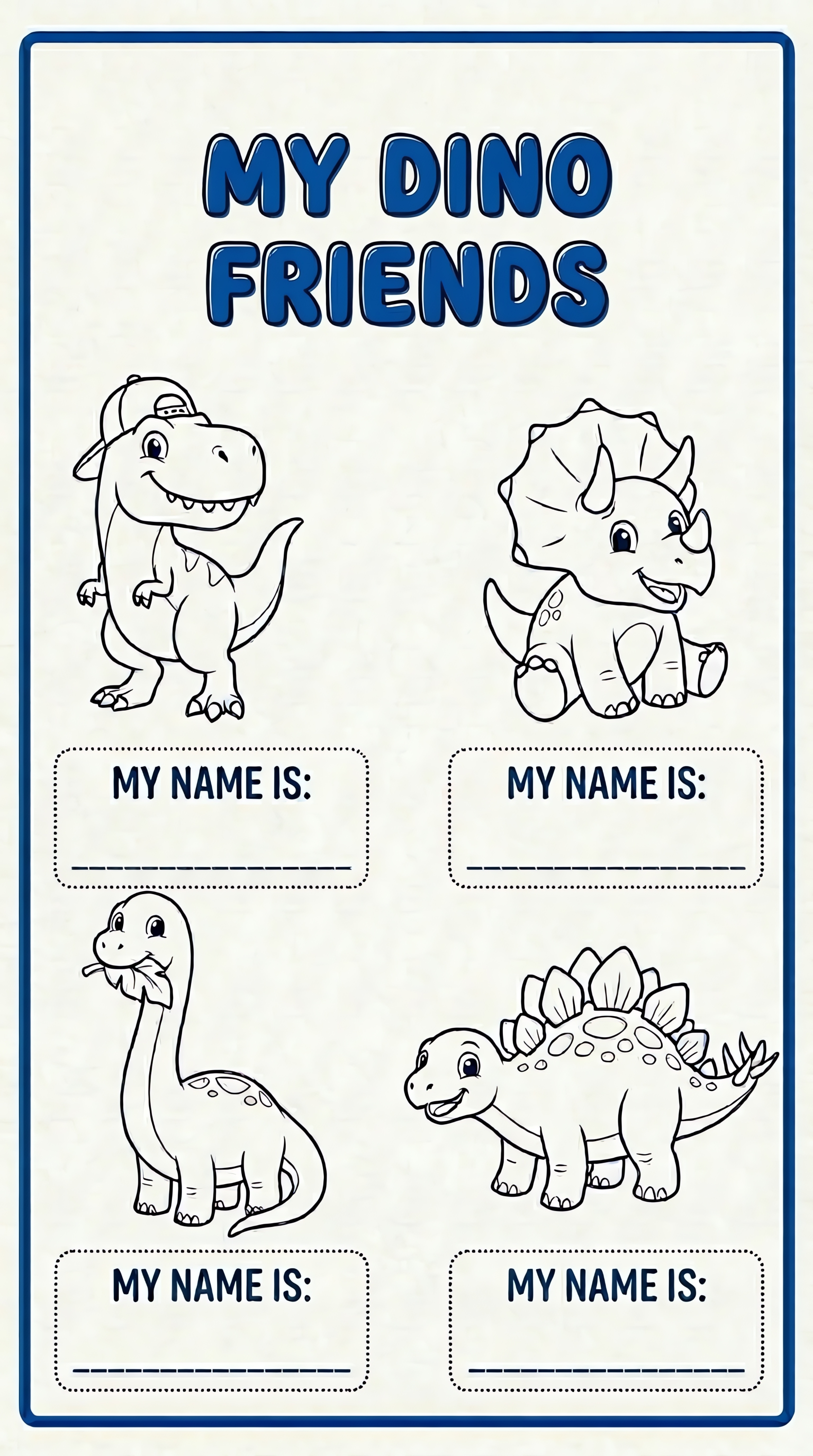 Hey little explorer! Are you ready to be a dinosaur expert? This fun page lets you pick up your pencil and write the names of your favorite prehistoric pals. It is a double-fun mission—first you practice your handwriting, then you get to use your brightest crayons to color them in! Perfect for kids aged 4-7 who are learning to write and love big dinosaurs.
